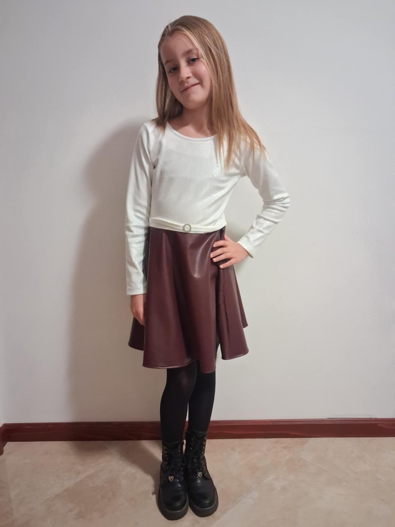 Killy felül fehér csillogó puha anyagú, alul puha bőr alkalmi ruha