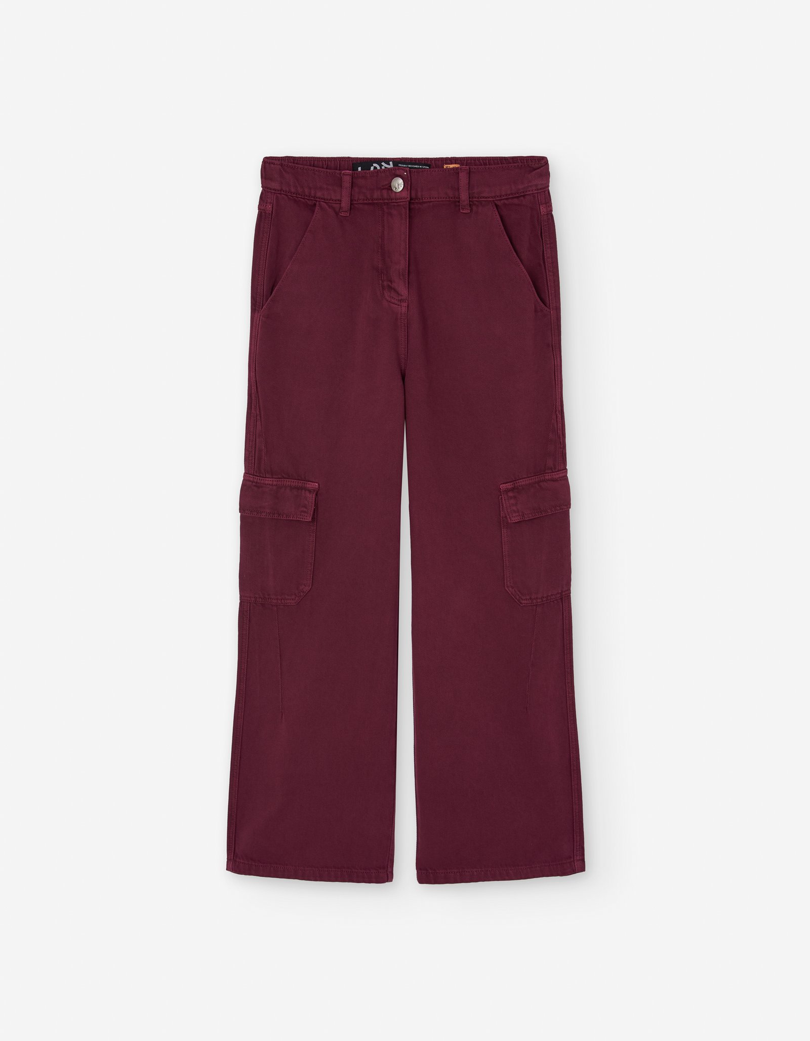 Losan burgundi színű rugalmas farmer anyagú, oldalt zsebes bőszárú nadrág, állítható derékrésszel
