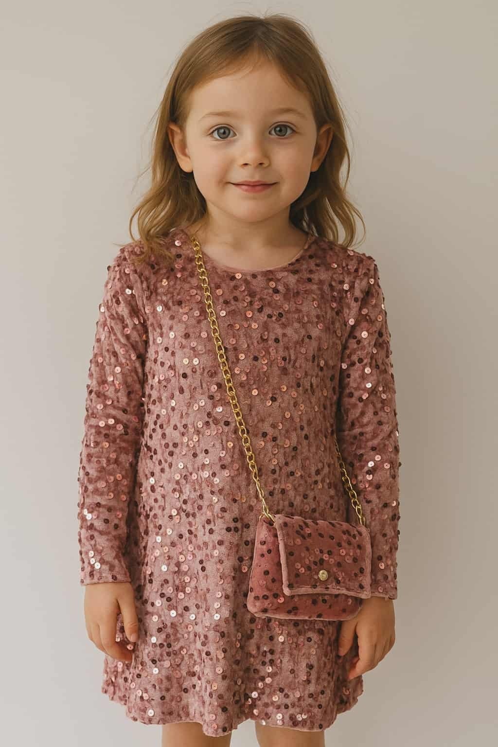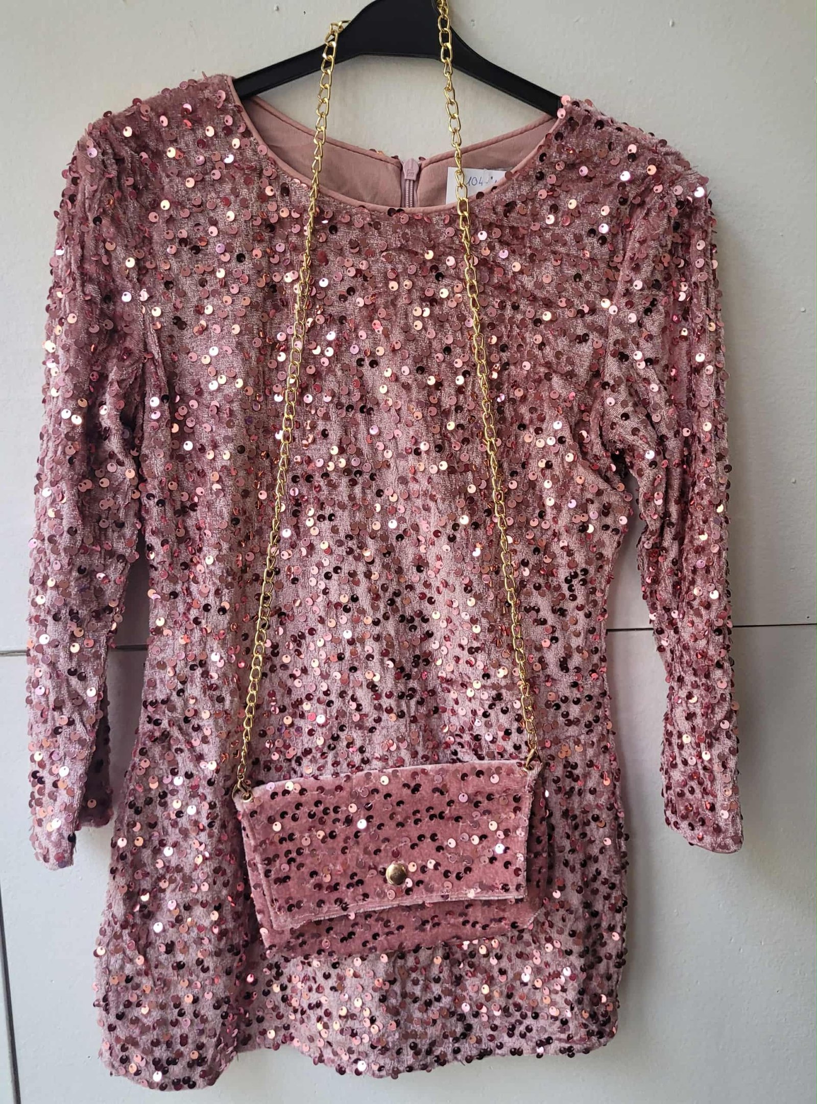 Mályva,plüss,flitteres egyenes ruha táskával