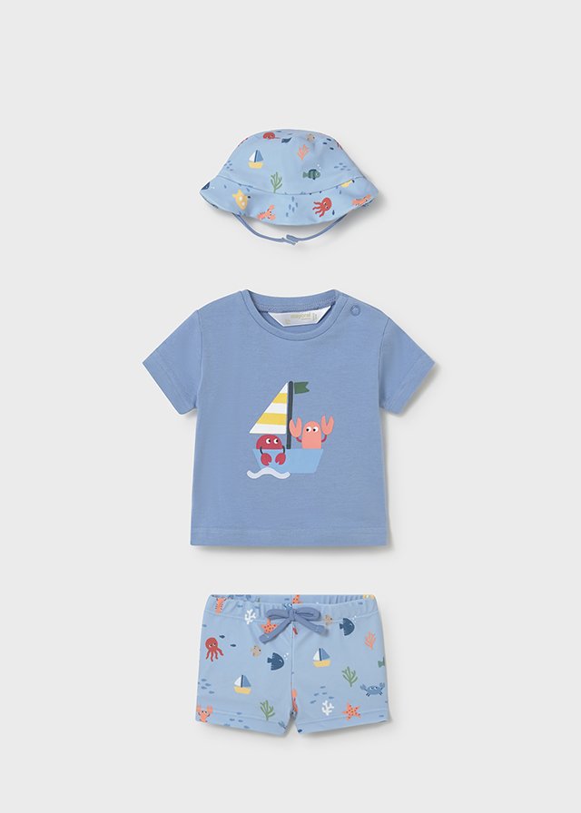 Mayoral,fiú,hajó mintás, fürdőruha szett;úszónadrág+kalap+póló