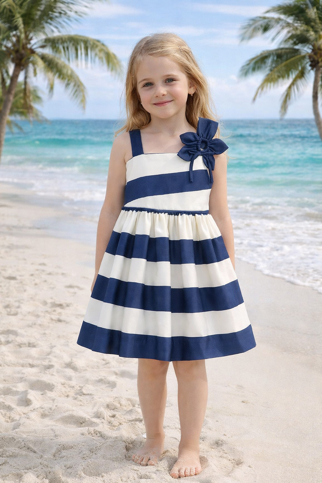 Mayoral,kék-fehér csíkos,vállon virág díszes ruha